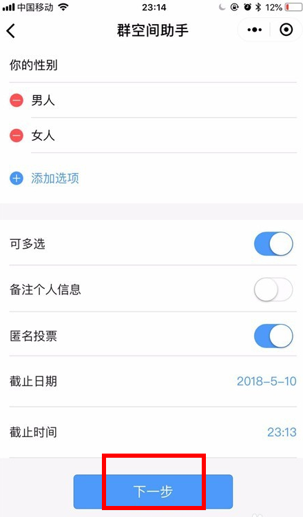 3.进入创建投票界面,编辑投票标题、选项、截止日期等。也可以根据自己的需要设置匿名或限制传播(注意:限制传播后,只能在一个微信群内投票)。