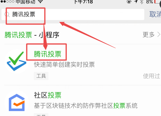 4.直接搜索“腾讯投票”,然后在搜索结果中点击“腾讯投票”。