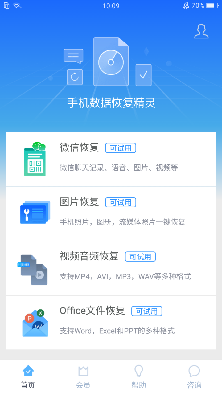 当然,有些朋友没有登录电脑,所以没有备份,所以无法使用上述方法恢复聊天记录。另外,我们还可以使用专业的数据恢复工具进行恢复,打开手机应用商店或者手机应用宝找到手机数据恢复向导,安装在手机上。然后打开软件的主界面。我们需要还原的是手机微信的聊天记录。点击微信恢复聊天记录。