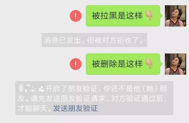 拉黑,对方给你发消息的时候,会提示消息已经发了,但是被对方拒绝了。删除,当对方给你发消息时,会提示你还不是他或她的朋友。它也可以通过重新身份验证添加回来。