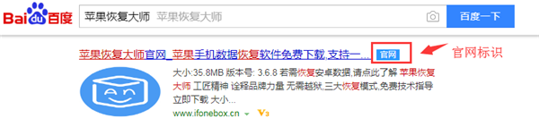边肖想推荐【苹果恢复大师】,这是一款超级好用的数据恢复工具,可以帮助恢复多种数据,支持多种手机型号。打开电脑,百度搜索“苹果恢复大师”。为确保下载的软件为正版软件,建议点击带有蓝色“官网”认证图标的链接,或直接访问Apple Recovery Master官网:www.ifonebox.cn/