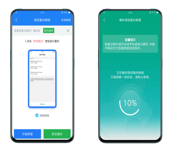 选择微信恢复后,点击自助恢复进入恢复页面。此时,您可以选择“开始还原”和“转到备份”。单击开始还原进入还原页面。扫描后可以在微信里找出聊天记录。最后,点击恢复,恢复手机删除的聊天记录。