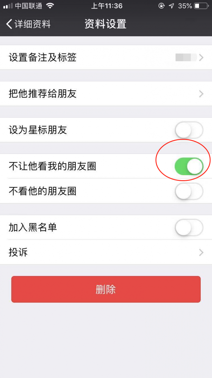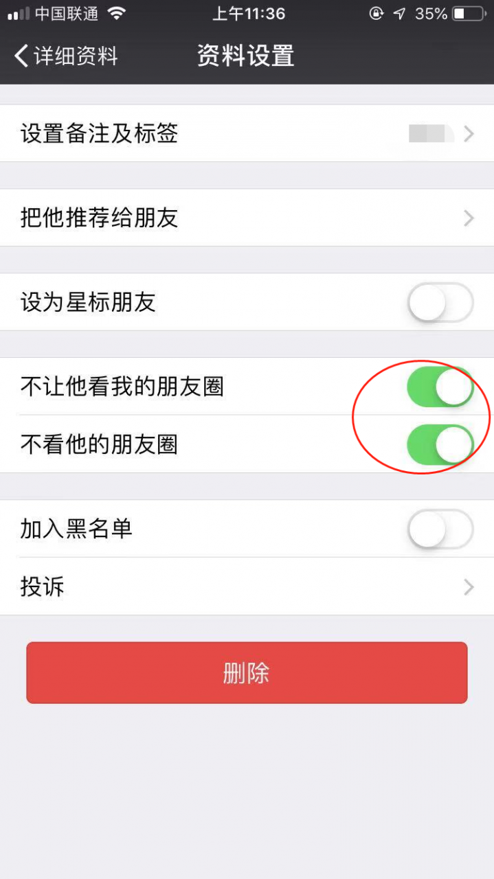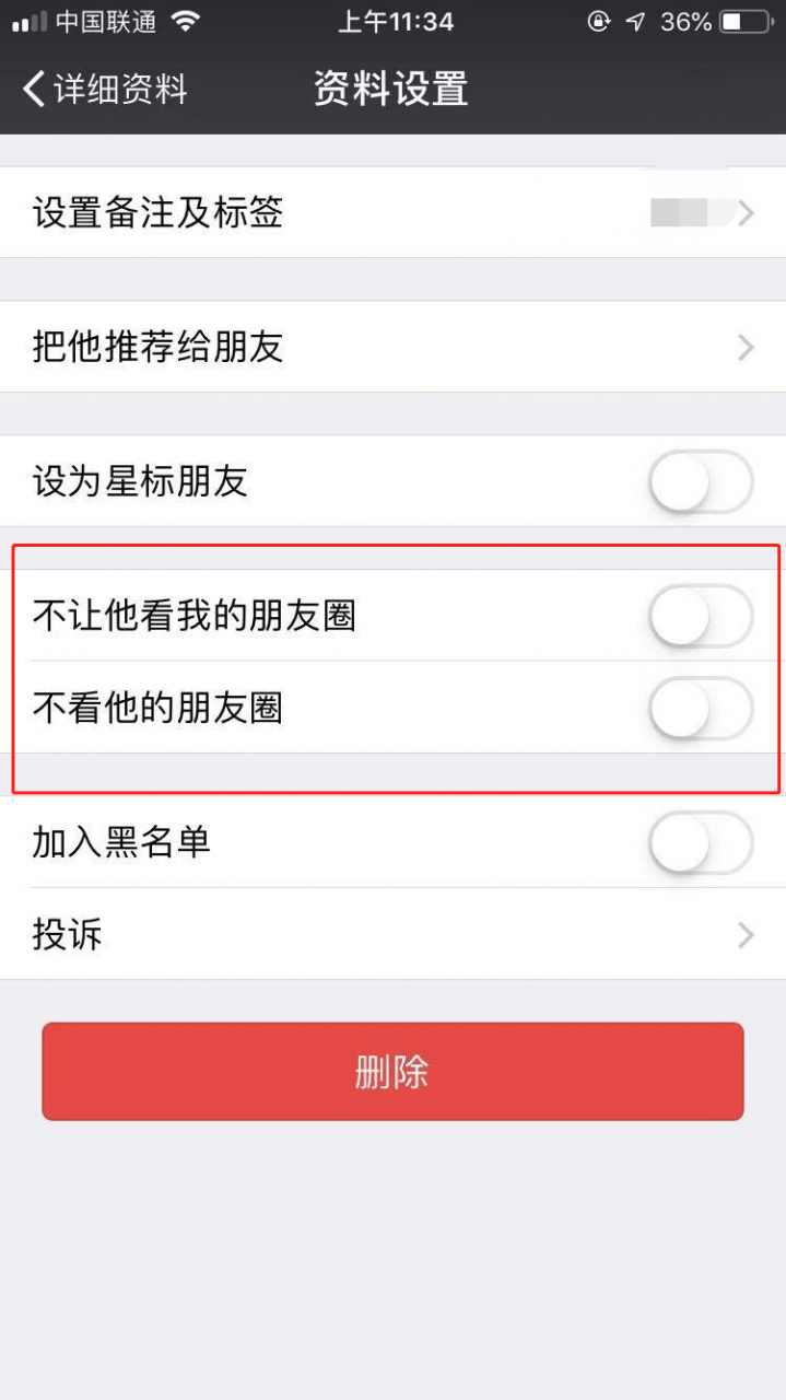 3.进入此页面后,找到两个中间设置选项,“不让他看我的朋友圈”和“不要看他的朋友圈”。