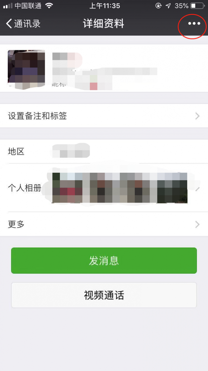 2.点击联系人照片进入联系人信息页面,找到右上角的三个小点,点击。
