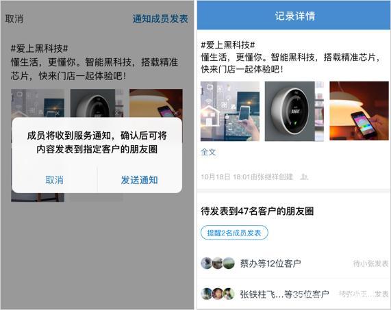 企业也可以统一创建内容,选择要展示的客户,经会员确认后发布到客户的微信朋友圈;同时,企业还可以查看其成员发布的内容进行监督。