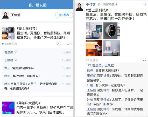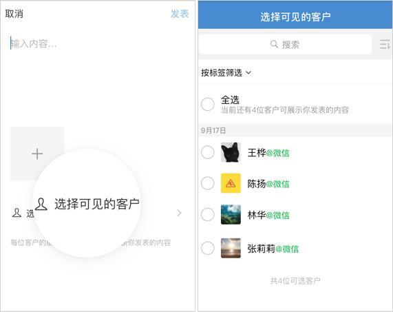 有权限使用客户朋友圈的会员可以在工作台上看到客户朋友圈的入口。编辑内容后,会员可以根据标签选择要显示的客户。发布后,客户可以在微信朋友圈查看并对会员发布的内容进行点赞和评论。