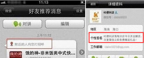 方式:将广告或促销信息放在签名文件上,用户在寻找附近的人或摇晃时会看到。