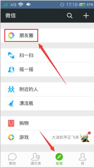 1.登录您的微信,点击【发现】,然后点击顶部的【朋友圈】。
