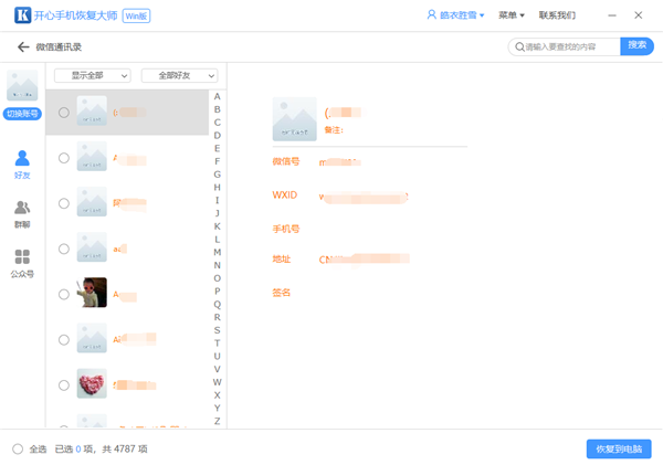 完成后,我们会以橙色字体显示我们删除的微信好友。勾选需要检索的好友,然后点击右下角的“还原到设备”或“还原到电脑”。