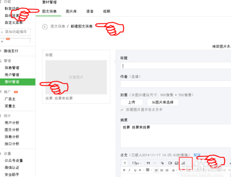 2.点击管理~素材管理~新增图文信息,打开图文信息,填写标题,上传图片,然后点击投票即可看到投票页面。