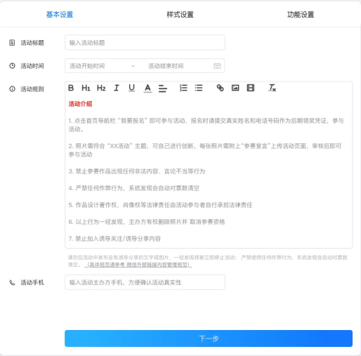 1.进入搜赞评选系统,首页后我们需要在导航栏中找到“自由创作”开始创作活动,并在基础设置中设置活动的主题、开始时间和结束时间(注:注册时请提交真实的申请材料参加活动);