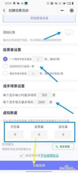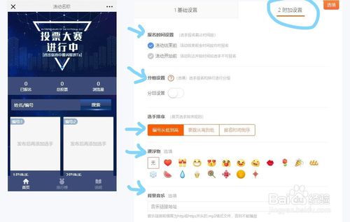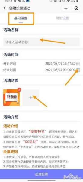 填写活动名称、活动时间,上传封面轮播,在基本设置中填写活动介绍,并设置选手报名及参赛规则、活动公告、投票人设置、选手设置、虚拟人数等。在附加设置中,如图所示。完成后单击创建投票。