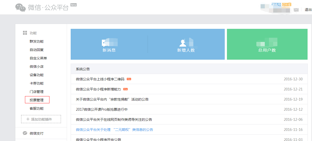 如果没有这样的菜单,可以点击添加功能插件,启用投票管理菜单功能。