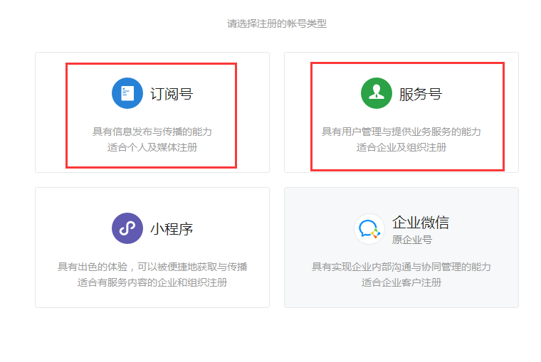 3.逐步填写信息。【服务号】每月可发布此内容4次,【订阅号】每天可发布内容。根据需要选择账户类型。