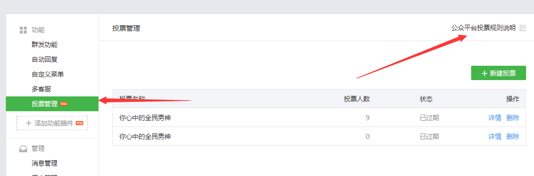 可以点击投票管理,右上角有投票说明。我用了几次,感觉投票功能不好用。你也可以试试截图: