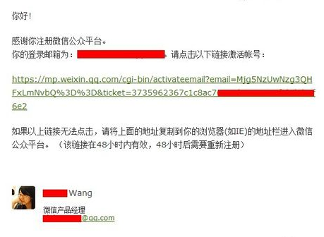 5.输入您的电子邮件后,您将收到激活您的微信帐户的电子邮件。请在输入电子邮件后点击以下链接激活您的帐户。
