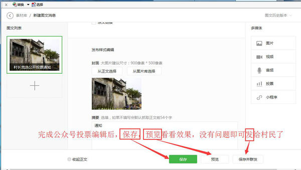 [6]保存/预览(可以在手机上预览效果)/保存并群发。