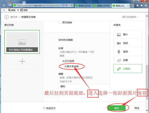 编辑图形消息中的图形消息。这里展示了单个图形消息,或者可以设置多个图形消息。方法是一样的。添加想要发布的图片和文字的标题、封面图片等信息。