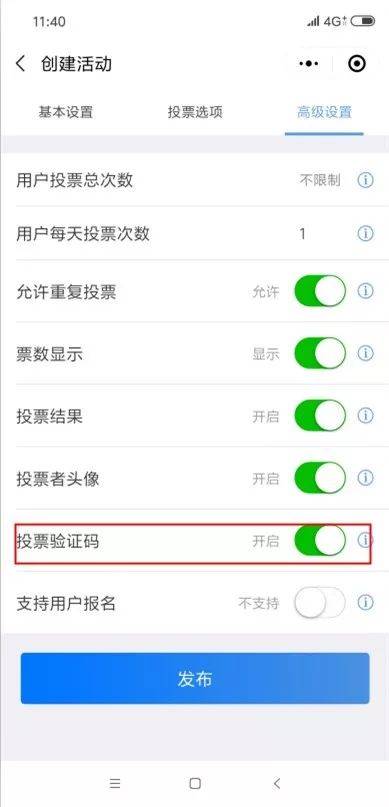 创建投票活动时,商家/组织者可以在【高级设置】中打开投票验证码,可以在一定程度上限制刷票现象。