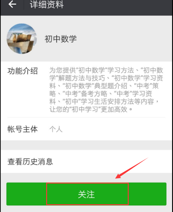 5、点开公众号,进入公众号菜单,最下方有一个“关注"的选项,点击关注。