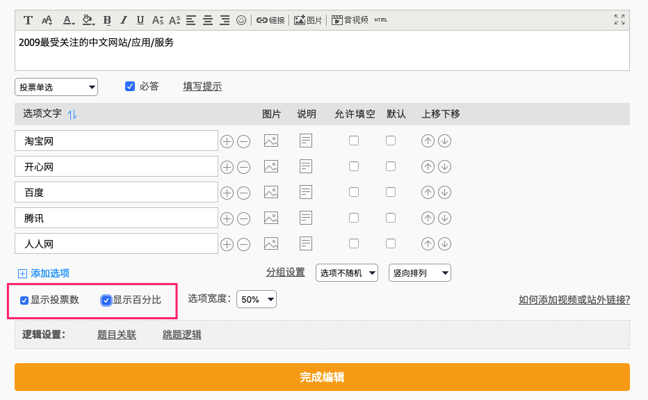 在设计问卷》问卷编辑页面,取消“显示票数”和“百分比”的勾选即可。如下图:
