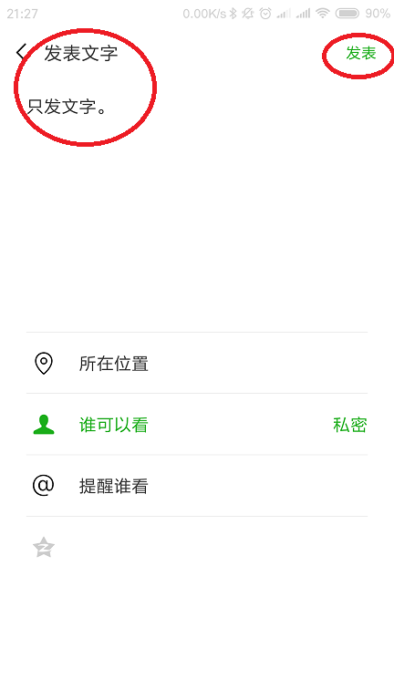 3、在“发表文字”界面输入想要发送的文字后,点击“发表”: