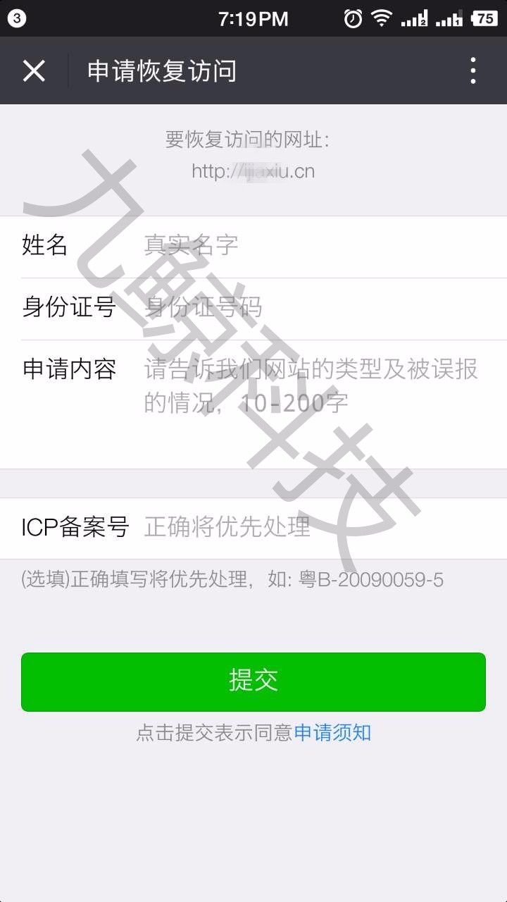 第一步、在手机微信中打开解封链接,根据提示点击“申请恢复访问”