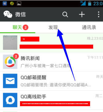 第二步:登录后,在微信首页点击【发现】,在点击【朋友圈】,如下图所示: