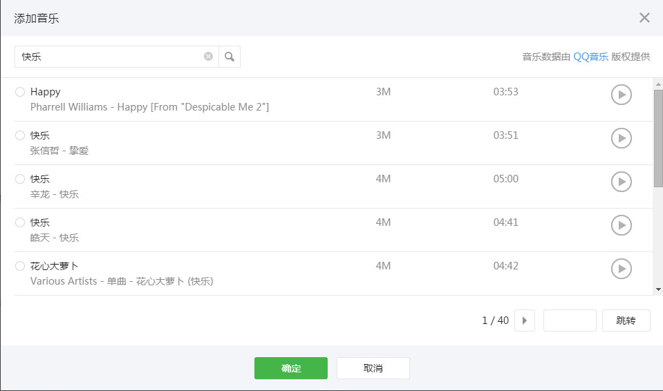 2、选取音乐时,支持根据歌名、作者进行搜索,并且可以试听音乐。
