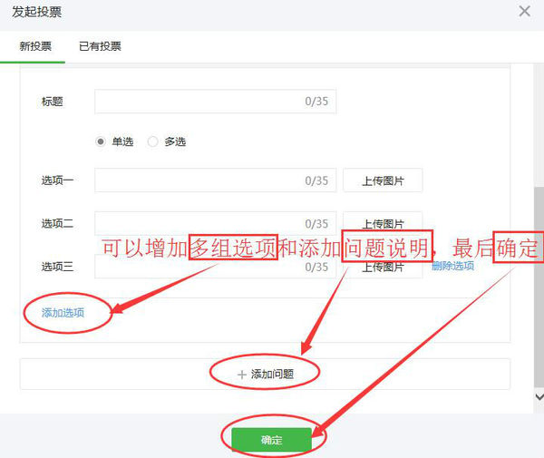 点击第选项发起投票发起投票界面输入投票标题补充信息选择单选/选输入投票选项内容余给选项点击+按钮添加选项