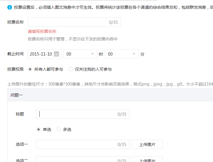 按照提示,输入投票的名称,截止时间,标题及投票选项后保存。