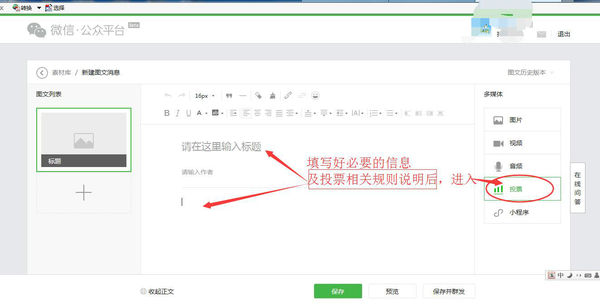 3、和普通的图文消息一样,先编辑一下简单的图文内容介绍一下投票内容。