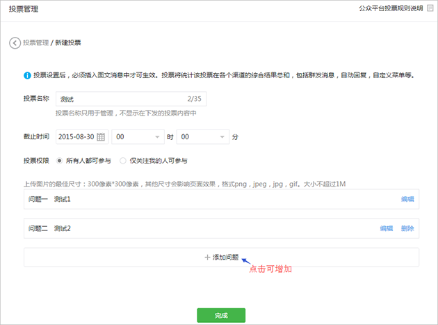 4、投票最多可设置10个问题、每个问题最多设置30个选项;