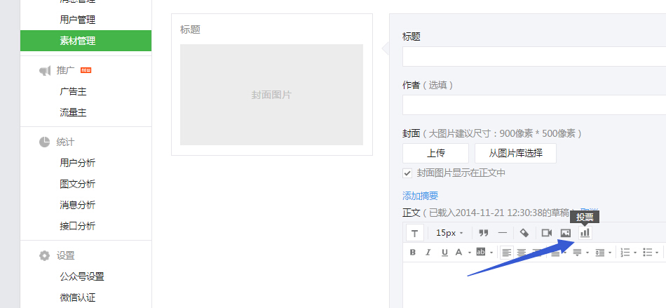 登录你的公众平台,左侧找到“素材管理”,右侧选择单或多图文随便选择一个点击进去。进去后就在这里了