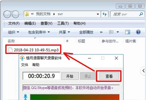 5、刚才双方通话的内容就被保存在了一个高质量的mp3文件中,可以通过点击软件界面上的“查看”按钮,找到刚才录制下来的文件。我们可以通过使用任意播放器,对该mp3文件进行播放,通常只需要双击,操作系统就会使用默认的播放器对其进行播放,这样,微信语音通话录音的功能就实现了。