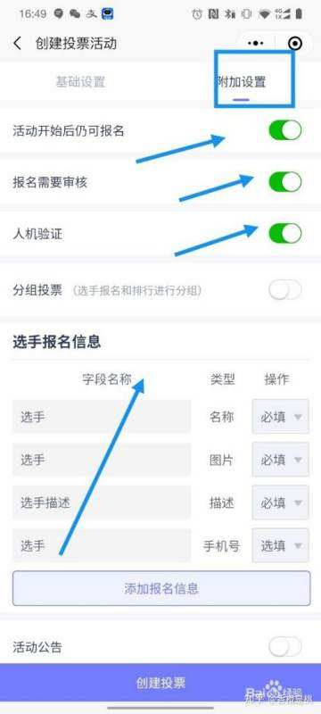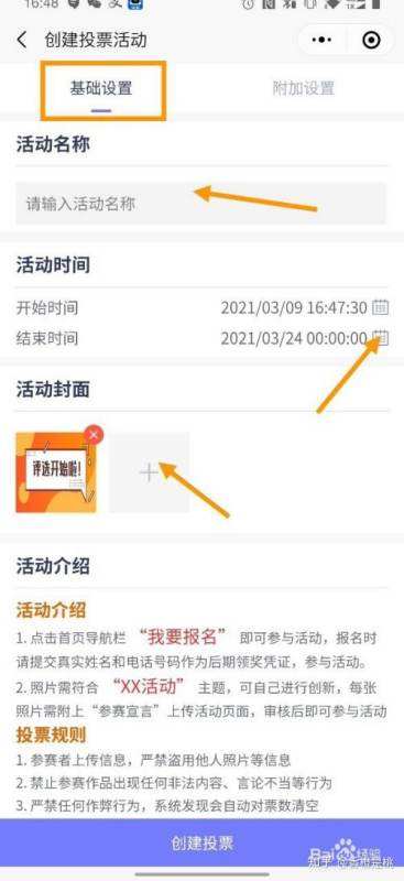 在基础设置中填写活动名称、活动时间、上传封面轮播图、填写活动介绍,在附加设置中设定选手报名以及参赛规则、活动公告、投票者设置、选手设置、虚拟数量等,如图所示,完成后点击创建投票