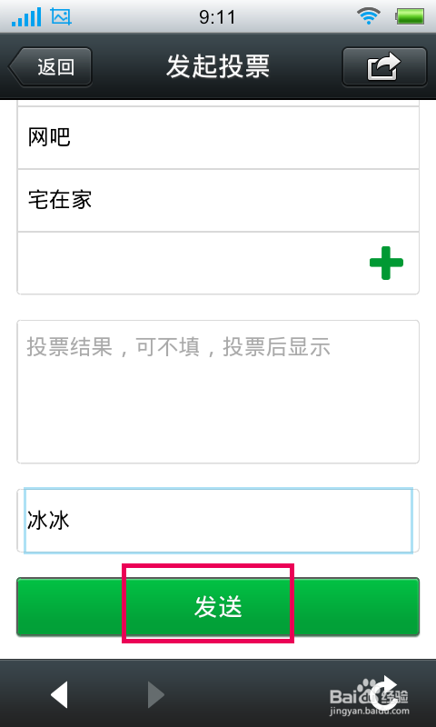 • 点击发送按钮之后成功发起投票,来到朋友全会看到自己发起的投票,点击发起的投票进入之后就可以投票了