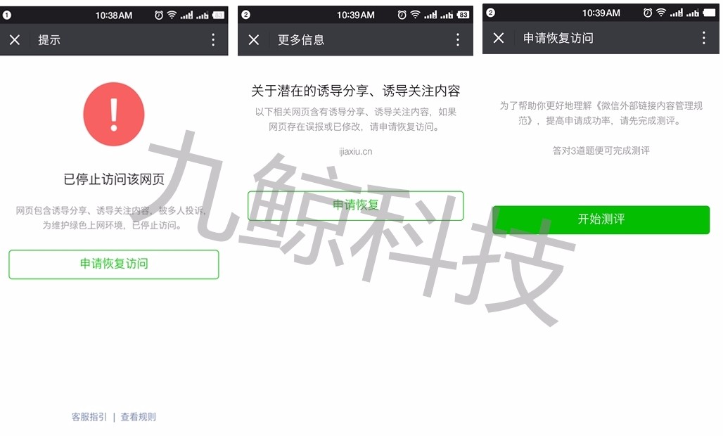 原因二:活动被误封,此种情况可以通过自助解封进行申述,一般(首次)会在20分钟内解封,域名多次被封,联系九鲸科技进行处理,一直更换域名绝非明智的选择,多次被封后甚至会导致公众号被封禁,资金冻结等严重后果;