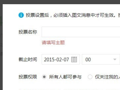 填写=》【投票主题】=》【投票类型】=》【设置投票时间】=》【选项设置】=》【确定】
