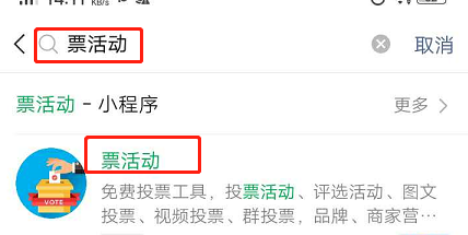 3.在搜索栏搜索“票活动”,点击打开“票活动”投票小程序
