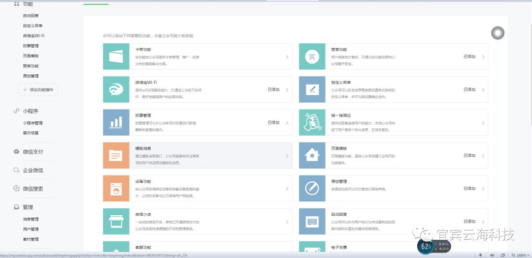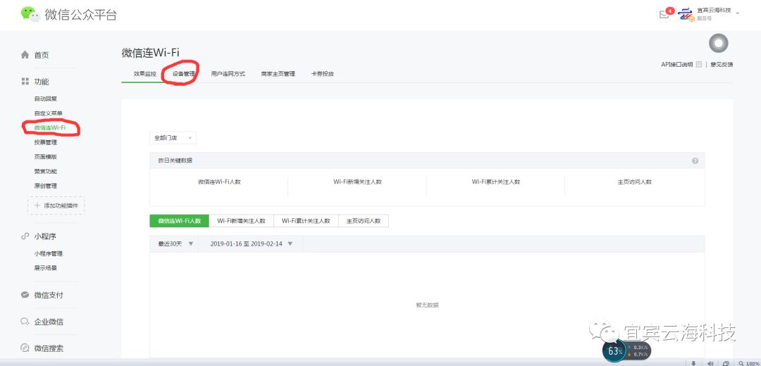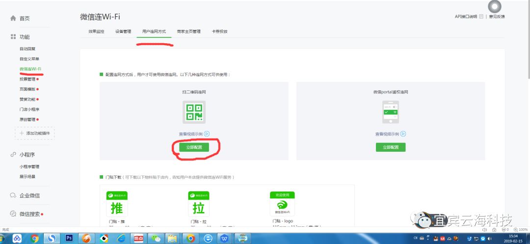 在工具栏下会出现微信链接wi-fi和门店小程序(由于我截图的号没有开通门店小程序,所以未显示出来)再分别点击进去,将这两个模块开通(根据提示开通,门店小程序上必须添加一个门店地址,也就是你需要扫二维码两wi-fi的地方。不懂的可以私下问我)