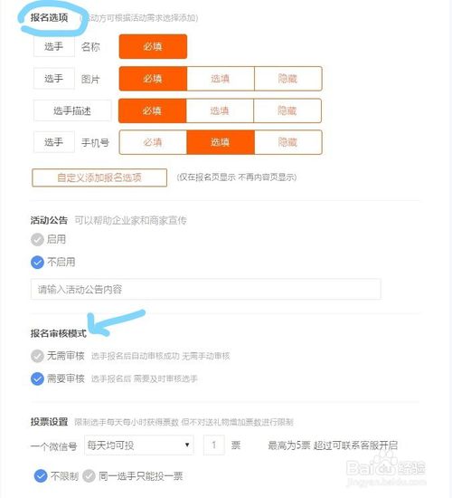 在基础设置中填写活动名称、活动时间、上传封面轮播图、填写活动介绍,在附加设置中设定选手报名以及参赛规则、活动公告、投票者设置、选手设置、虚拟数量等,如图所示,完成后点击创建投票