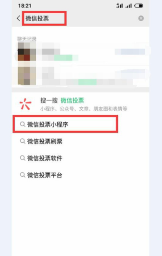 1、打开微信,在搜索栏里输入“微信投票”,在下面的关联窗口里单击“微信投票小程序”进行搜索,