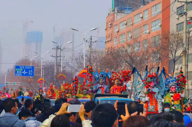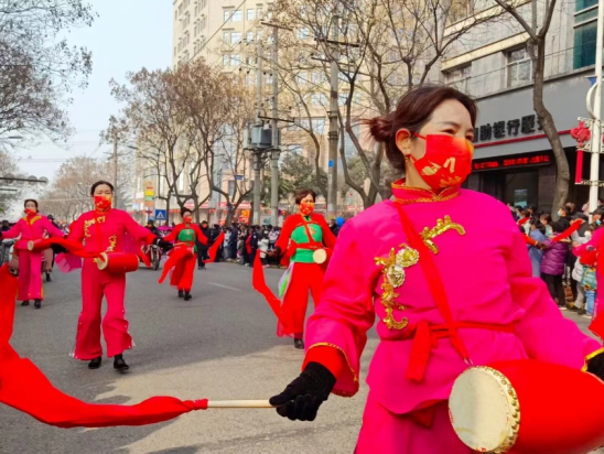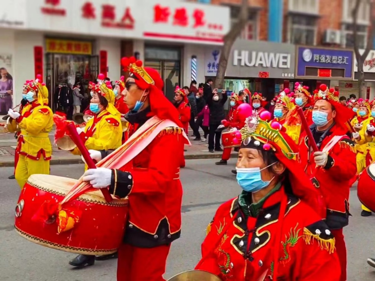 紧接着,队伍后面便是秧歌队伍了,一个个阿姨大妈精心打扮,穿红带绿,个个腰间别着大红锣鼓,敲得起劲,好不热闹。对了,为了落实防疫要求,今年的社火队伍里,除了戏里扮了花脸的人物,其余演员都戴上大红口罩,热闹的同时防疫工作也要做好!
