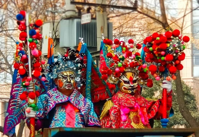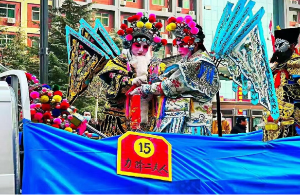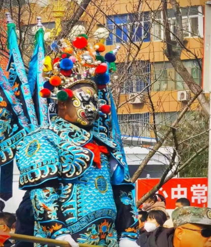 而在秧歌队伍之后,便是各种戏里的人物了,也是整个社火的看点了,我们陈仓社火尤其以封神神话人物为主要表现形式,郁垒神荼是汉族民间信奉的两位门神,神荼身着斑斓战甲,面容威严,姿态神武,手执金色战戢;而郁垒一袭黑色战袍,一掌轻抚着坐立在他身旁巨大的金眼白虎,寄托了汉族劳动人民一种消灾免祸、趋吉避凶的美好愿望。