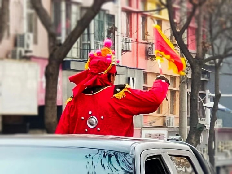 而走在队伍后面的,则是由各种人组成的锣鼓队,上有六七十的老人,下有十几岁的年轻小伙,前面车上的老爷爷指挥着大家,全部跟着节奏开始敲锣打鼓,也给这场社火增添了更浓重的年味。
