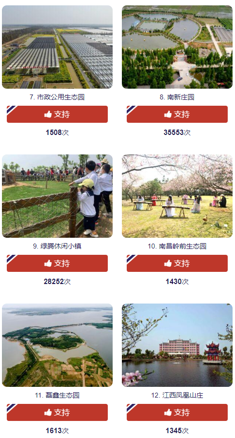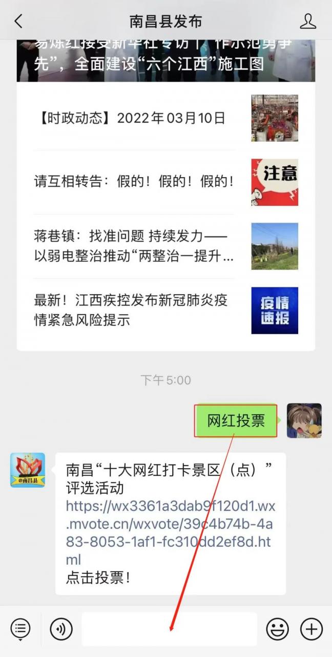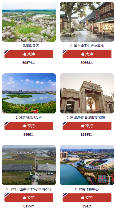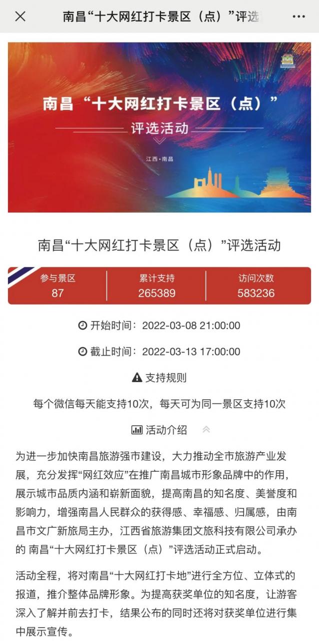 由南昌市文广旅局主办, 江西省旅游集团文旅科技有限公司承办的 南昌“十大网红打卡景区(点)” 评选活动启动 南昌县内 凤凰沟景区、煌上煌工业旅游基地 澄碧湖湿地公园、原城纪·南昌城市文化街区 印智田园综合体&小白鹤农场、昌南体育中心 市政公用生态园、南新庄园 绿腾休闲小镇、南昌岭前生态园 磊鑫生态园、江西凤凰山庄 湖光山舍田园农庄、海湾农庄 国鸿生态园、工控陌上园 赣江昌南外滩公园 位列其中! 还在等什么?快为您喜欢的景区(点)投上宝贵的一票吧! ↓↓ 南昌“十大网红打卡景区(点)”邀你投票! 投票时间 2022年3月8日21时—2022年3月13日17时 参与投票方式 关注“南昌县发布”公众号关注后在底部回复框内 输入关键字“网红投票”点击链接 即可进入投票页面 注:每个微信每天能支持10次,每天可为同一景区支持10次。 快快转发给身边人一起投票吧~ 转载请注明:微信点赞 » 微信投票!南昌“十大网红打卡景区(点)”评选活动开始啦