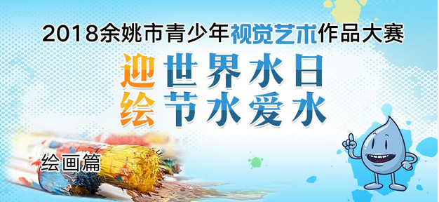 2018年3月22日是第二十六届“世界水日”,3月22日-3月28日是第三十一届“中国水周”,今年我省的宣传主题为“凝聚全社会节水合力,构建全覆盖节水格局”。为提升我市青少年节水爱水的意识,深入领悟“绿水青山就是金山银山”“保护水资源,珍惜每滴水”的理念,激励青少年参与书画、数字影像艺术创作,培养继承民族文化的新生力量,凝聚全社会节水合力。共青团余姚市委、余姚市水利局、余姚市教育局、余姚市少工委、余姚市青年联合会、余姚市青年企业家协会决定联合开展“迎世界水日,绘节水爱水”余姚市青少年视觉艺术作品征集活动。