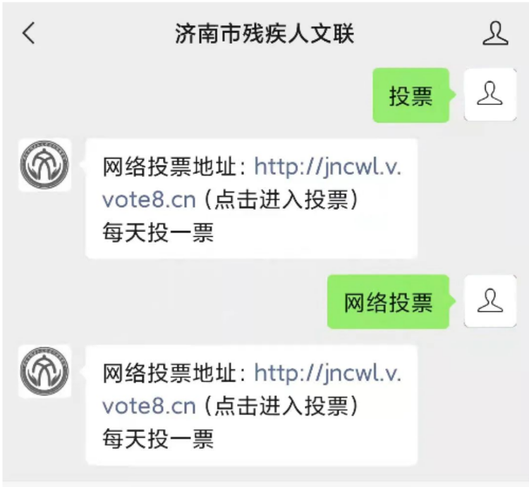 在济南市残文联的微信公众号(JNCWLH),输入“网络投票”