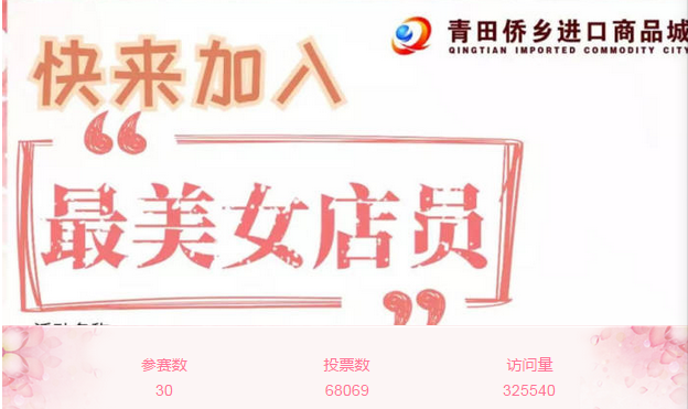 活动范围:所有青田进口商品城女工作人员均可参赛,喊上亲朋好友为你投票吧!